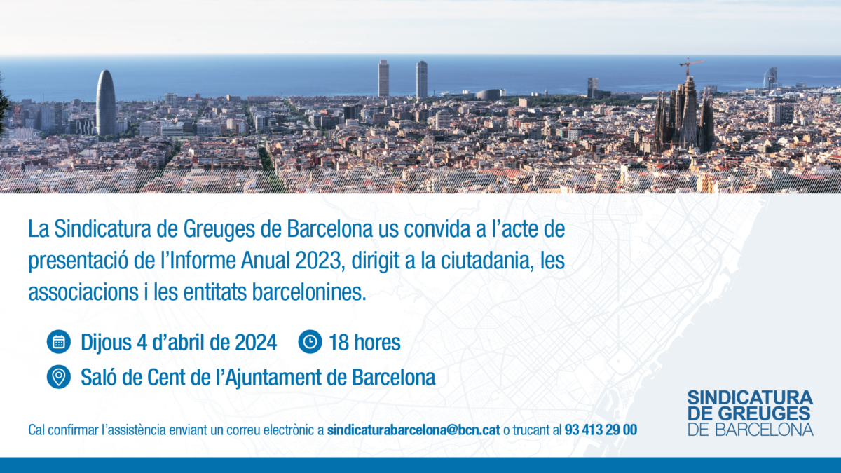El acto de presentación del informe anual 2024 será el jueves 10 de abril a las 18 horas en el Saló de Cent del Ayuntamiento de Barcelona. Es obligatorio confirmar asistencia con antelación.